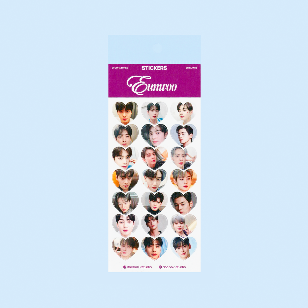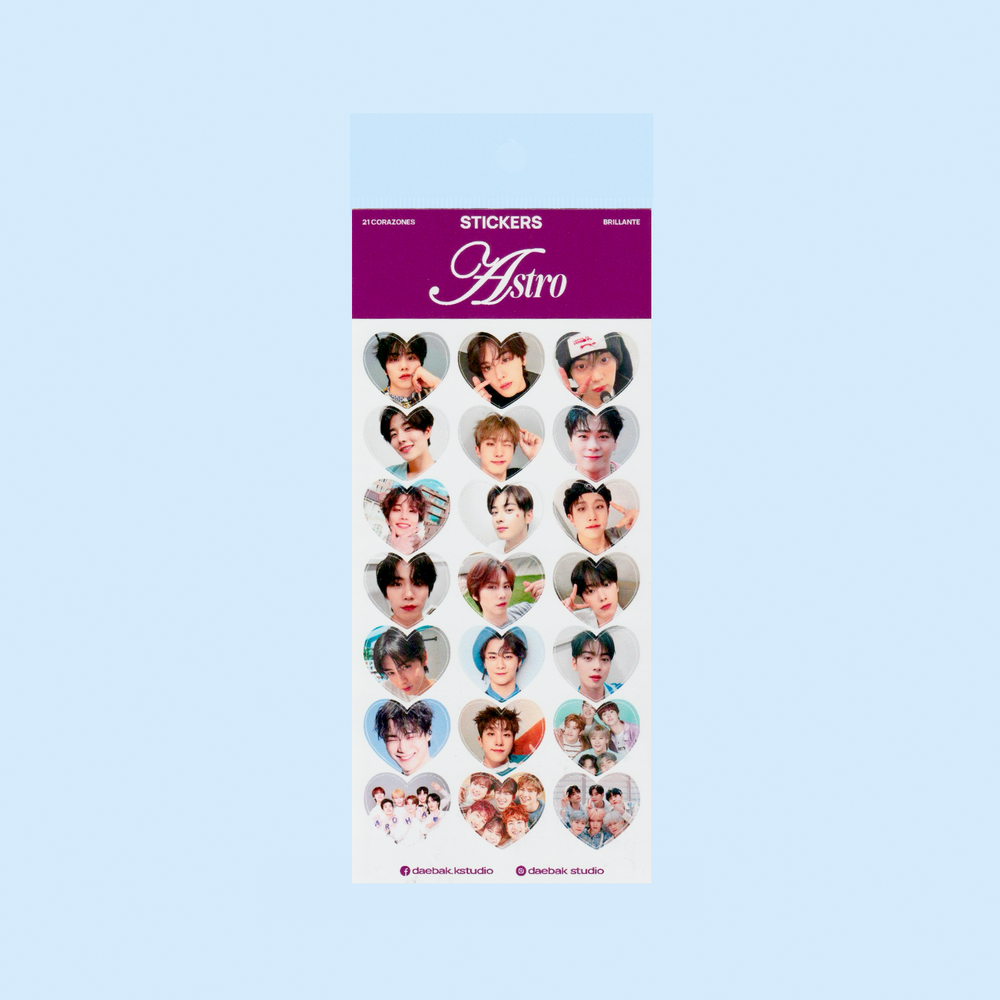 Set de stickers fanmade de ASTRO en forma de corazón con fotos en alta calidad.Entre ellos encontrarás diseños individuales de cada integrante y otros en los que comparten escena como