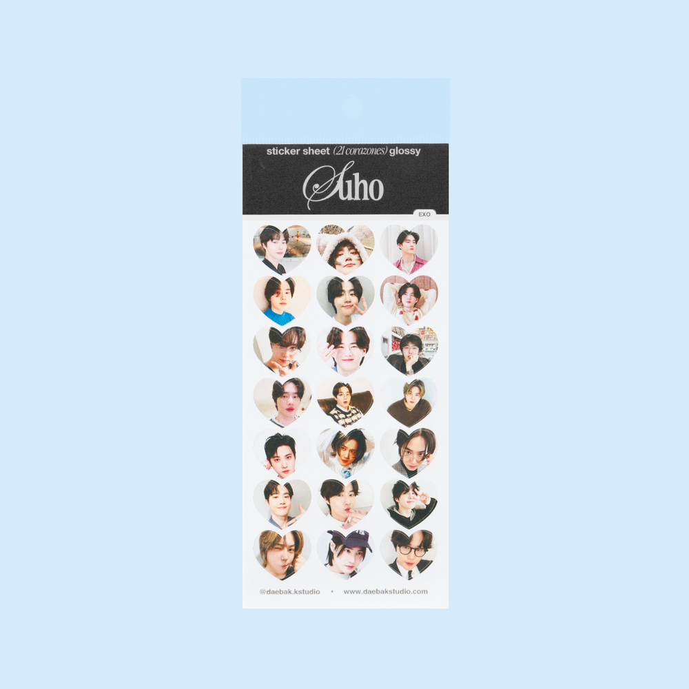 Set de stickers personalizados con fotos individuales de los integrantes de EXO en alta resolución. Cada calcomanía tiene forma de corazón y muestra a un miembro diferente, ideal para fans