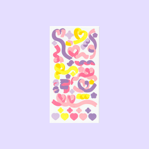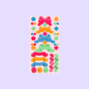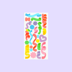 Agrega un toque de color y fantasía a tus proyectos con esta hoja de stickers llena de moños, cintas, estrellitas y figuras curvas en tonos vibrantes. Cada plantilla incluye diseños únicos tipo confetti que combinan perfecto con álbumes de photocards, journaling, cuadernos, scrapbooking o regalos especiales.
