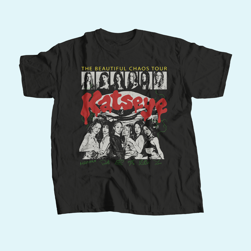 Playera KATSEYE – The Beautiful Chaos Tour en color negro, inspirada en la estética de tour con un diseño gráfico de alto impacto que reúne retratos del grupo en estilo vintage, tipografía llamativa y un acabado visual con carácter fuerte y coleccionable. Confeccionada en algodón suave y cómodo, esta playera ofrece un corte versátil ideal para uso diario, outfits casuales o para llevar a conciertos y eventos de fandom. Es una pieza pensada para fans de KATSEYE que buscan merch con presencia, identidad y un diseño que destaque dentro del k-pop, perfecta tanto para colección como para regalo. Optimizada para quienes buscan playera KATSEYE, merch KATSEYE, playera k-pop en México y playera de tour KATSEYE.