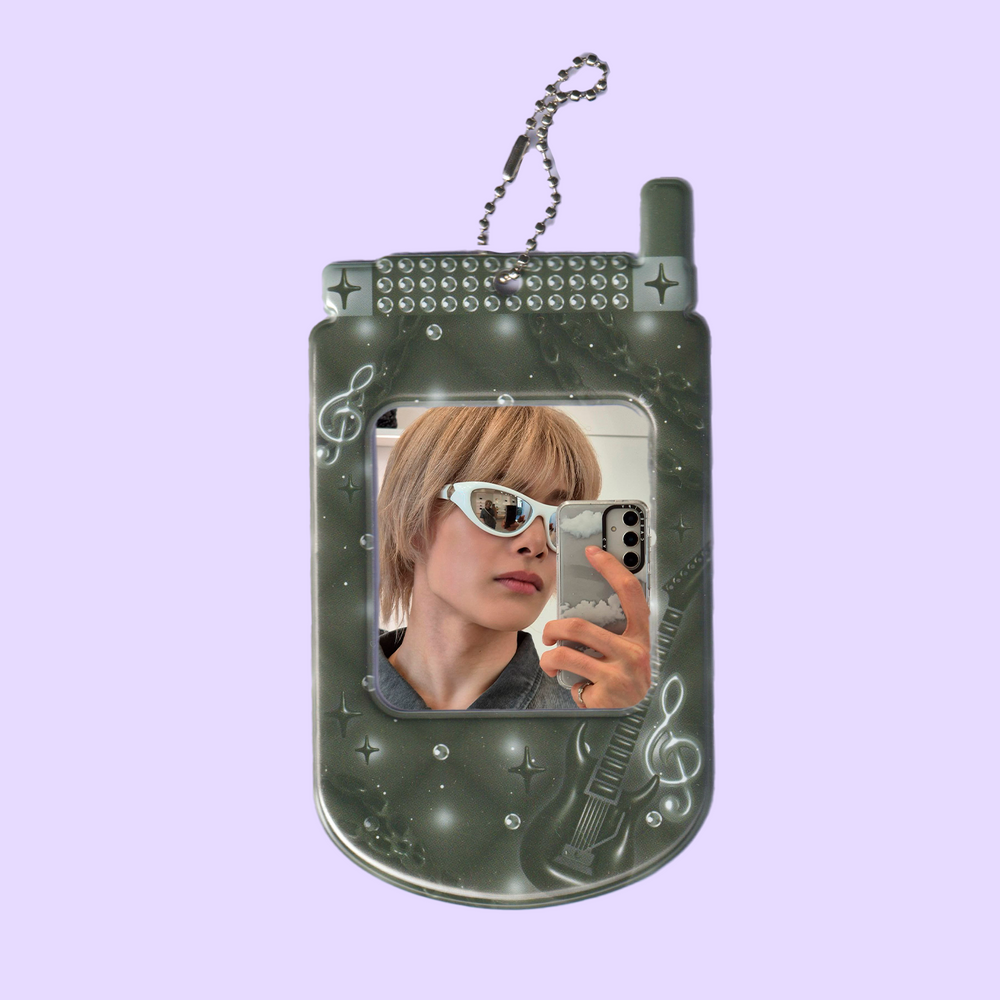 Dale un toque Y2K a tu colección con este llavero tipo celular vintage. El diseño incluye detalles de guitarra, notas musicales y brillitos en relieve que hacen que tu photocard destaque con una estética única y audaz.