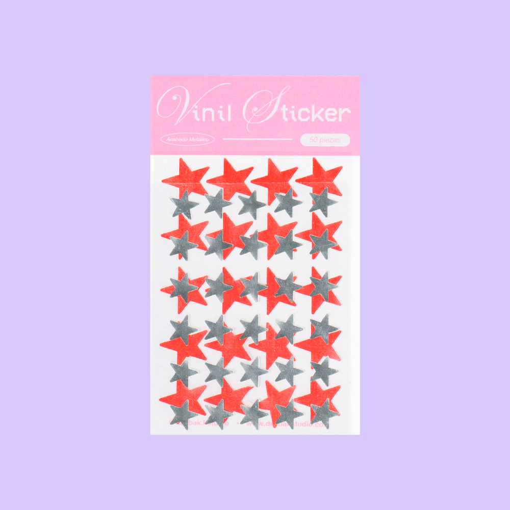 Un set de 50 estrellas de vinil metálico, diseñadas para resaltar en cualquier superficie. Contiene 20 estrellas rojas y 30 estrellas en tono metálico plata, con acabado brillante que refleja