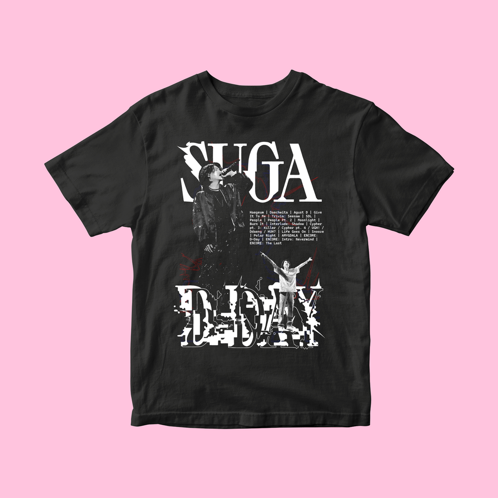Esta playera negra no es solo una prenda, es una declaración de amor por la música de Suga. Con el texto 'SUGA' en la parte superior y 'D-DAY' en la inferior, esta pieza única te permite llevar contigo la esencia del artista. En el centro, una lista cuidadosamente diseñada destaca algunas de sus canciones más emblemáticas como 'Haegeum', 'Daechwita' y 'Agust D'.