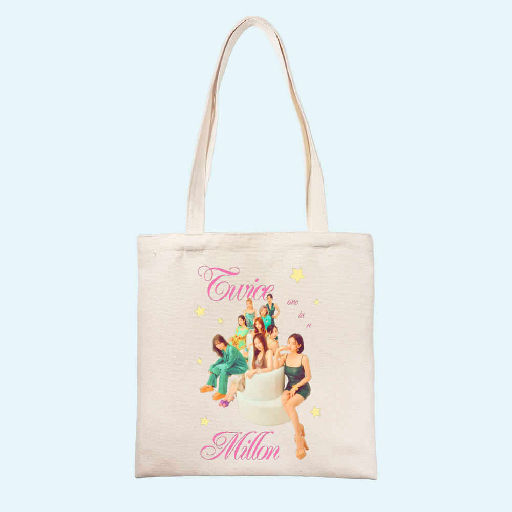 Lleva contigo la magia y el carisma de TWICE con esta tote bag inspirada en el icónico mensaje de amor y conexión del grupo. Decorada con una vibrante imagen grupal y detalles en estrellas, esta bolsa captura la esencia única y encantadora de las integrantes. Fabricada en algodón duradero, es perfecta para tus actividades diarias, ya sea para llevar libros, compras o tus accesorios favoritos. Un accesorio imprescindible para cualquier ONCE que quiera mostrar con orgullo su admiración por TWICE y su mensaje de ser "One in a Million".