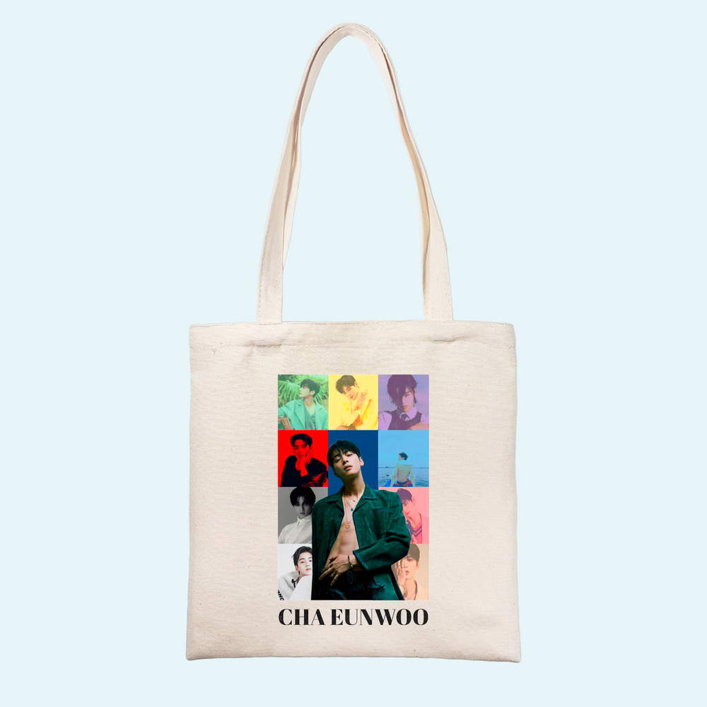 Lleva la elegancia y el carisma de Cha Eunwoo contigo con esta tote bag de diseño exclusivo. Con un collage de imágenes vibrantes y estilizadas, esta bolsa captura las diferentes