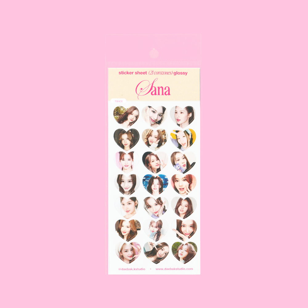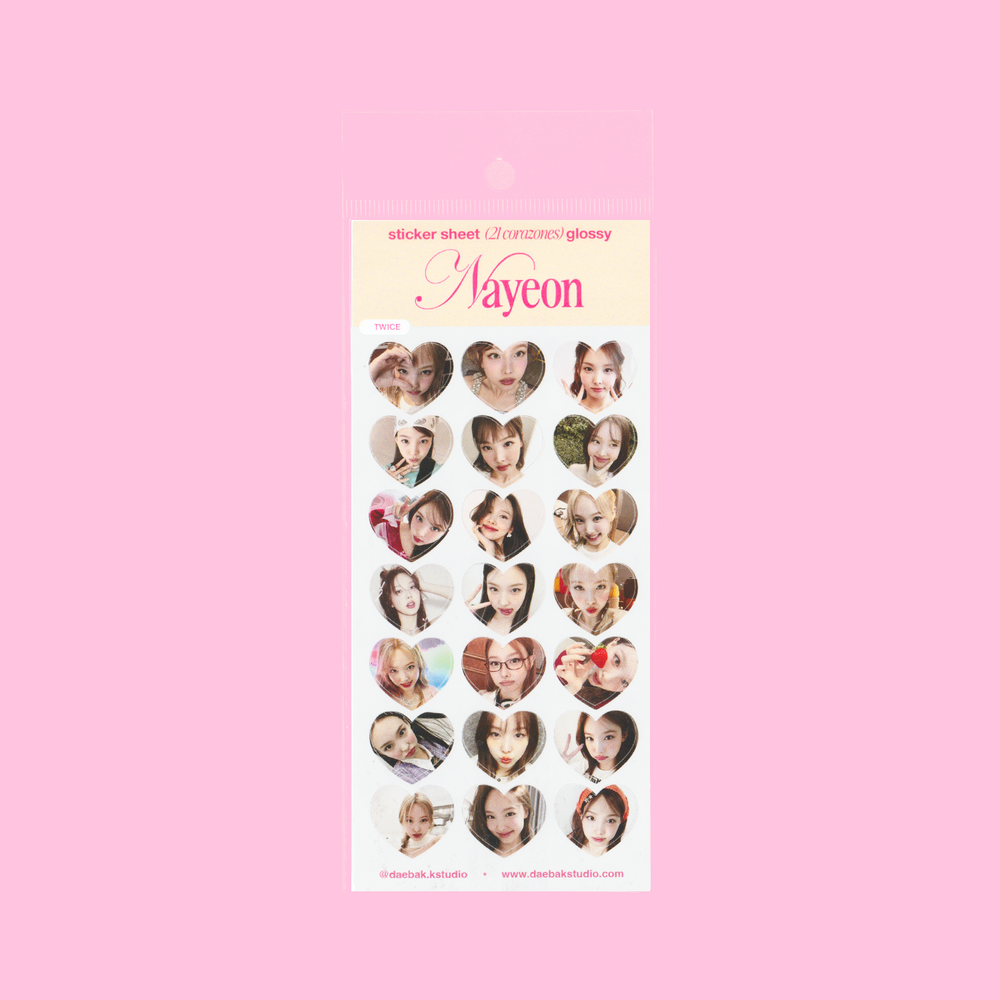 Una hoja de stickers fanmade con 21 corazones brillantes, cada uno con una imagen individual de las integrantes de TWICE. Nayeon, Jeongyeon, Momo, Sana, Jihyo, Mina, Dahyun, Chaeyoung y Tzuyu están presentes en distintas etapas y estilos, capturando su esencia en cada recorte.