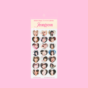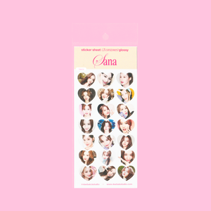 Una hoja de stickers fanmade con 21 corazones brillantes, cada uno con una imagen individual de las integrantes de TWICE. Nayeon, Jeongyeon, Momo, Sana, Jihyo, Mina, Dahyun, Chaeyoung y Tzuyu