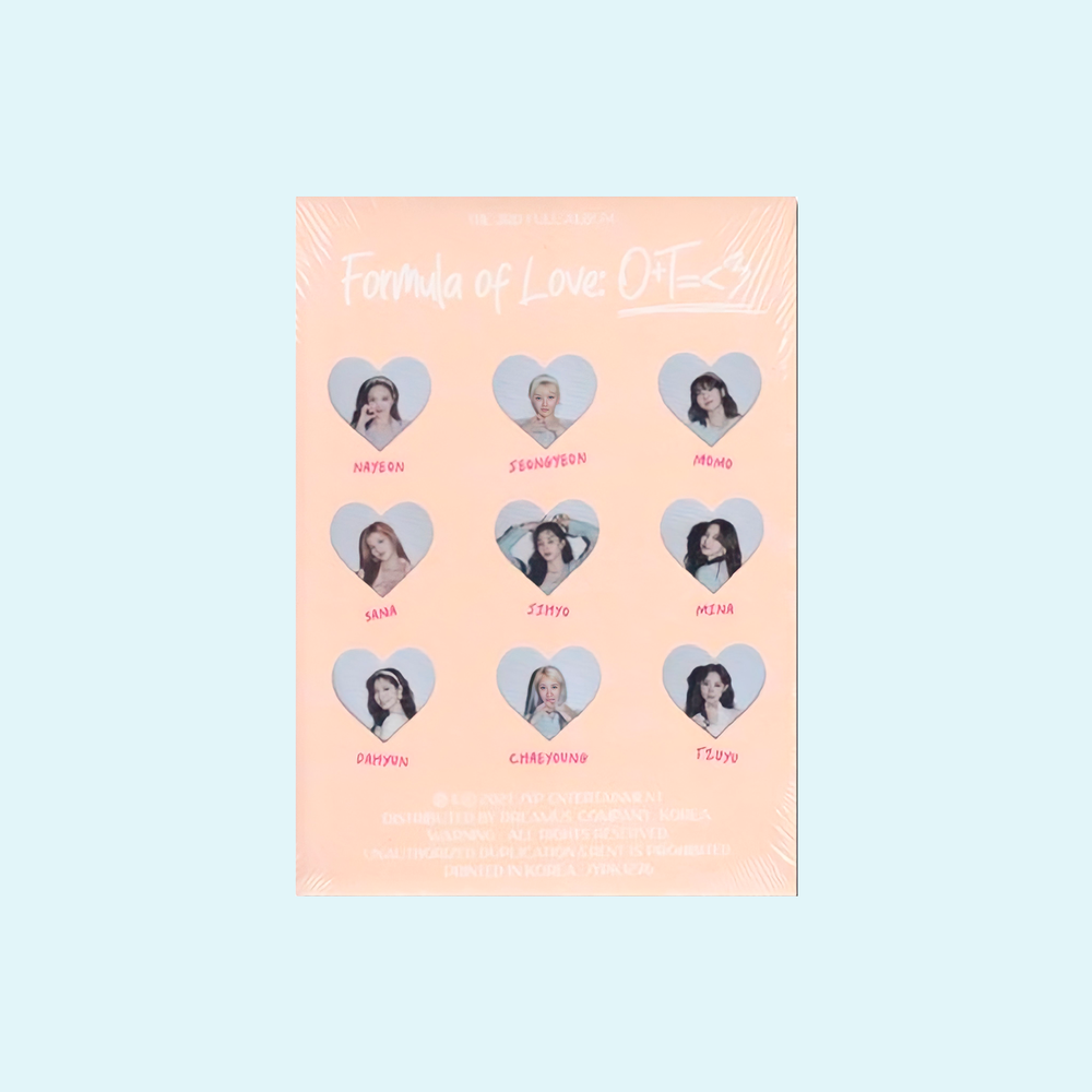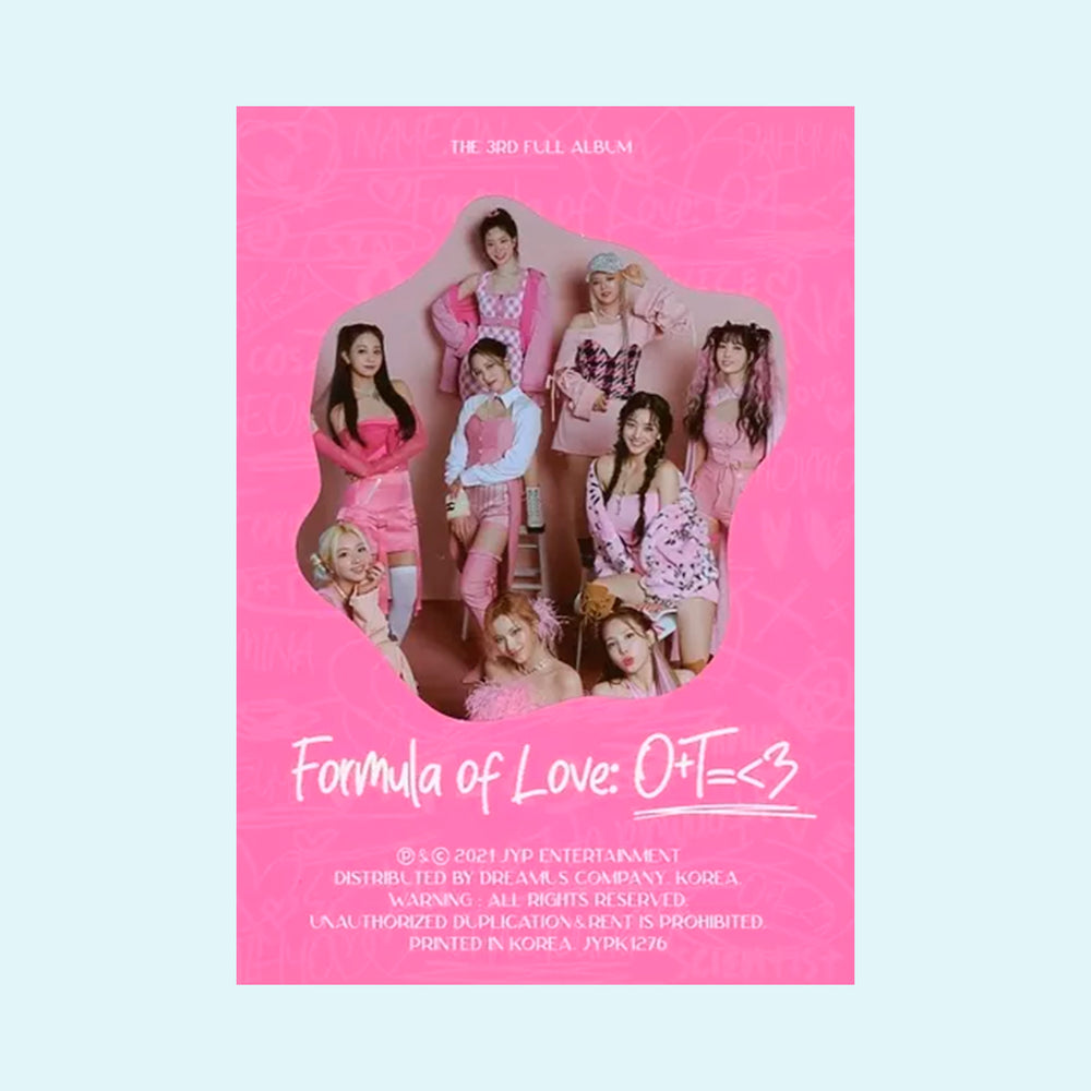 Formula of Love: O+T=<3 es el tercer álbum de estudio del icónico grupo femenino TWICE, lanzado el 12 de noviembre de 2021 bajo el sello JYP Entertainment. Este álbum explora diversas facetas del amor y destaca por su mezcla de estilos musicales como pop, dance, R&B y synth-pop, consolidando aún más la posición global del grupo.