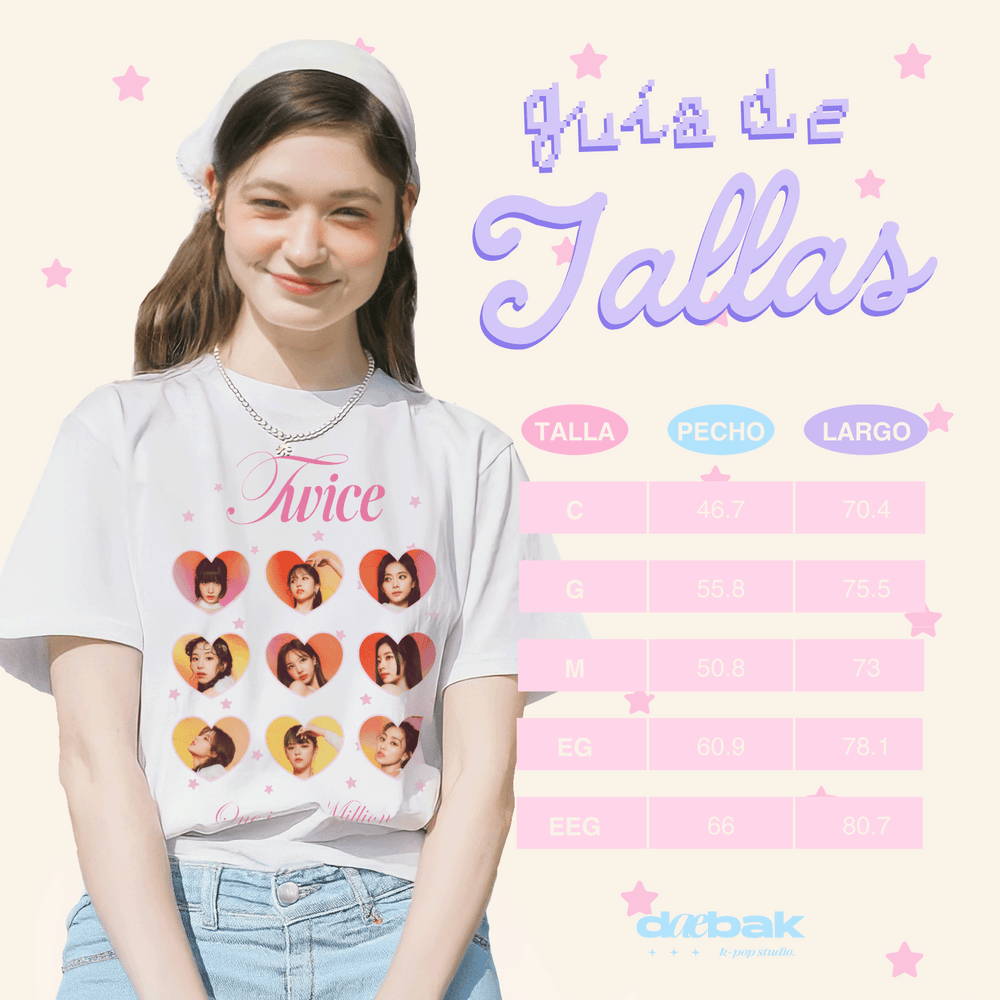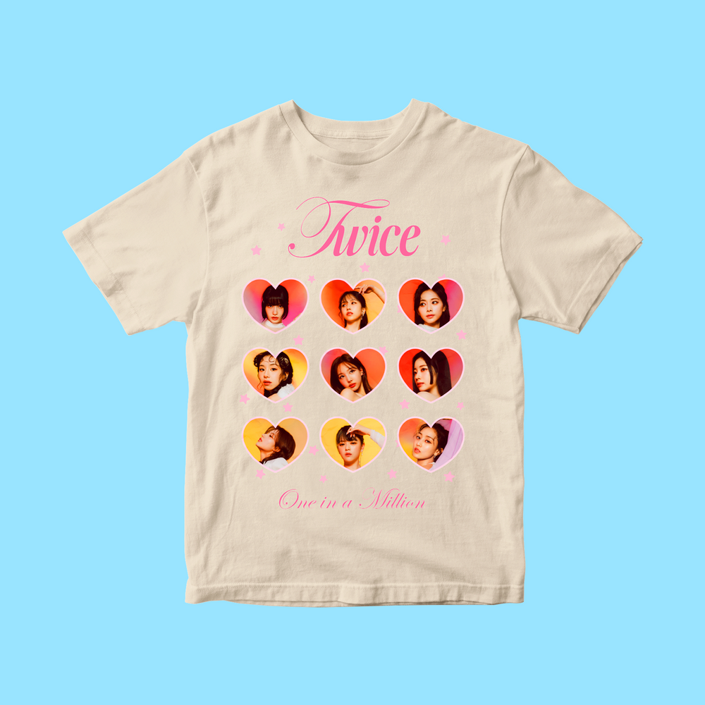 Lleva a Twice en tu corazón con la camiseta 'One in a Million'. Un diseño exclusivo que celebra a cada miembro del grupo. Ideal para conciertos, reuniones, o para el día a día. ¡Muestra tu amor y sé parte de los ONCE con esta pieza única!
