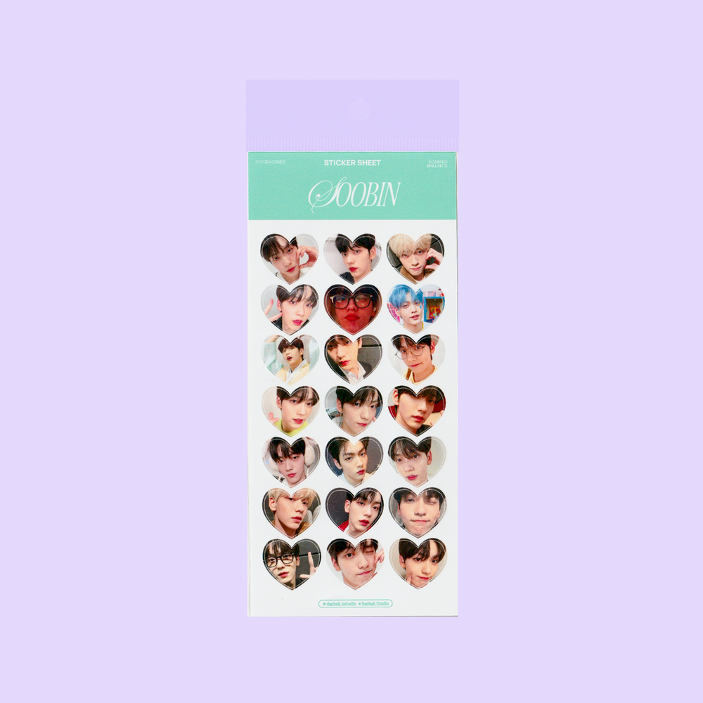 Set de stickers fanmade con fotos individuales de TXT en alta calidad. Cada sticker tiene forma de corazón e incluye a los cinco miembros por separado.