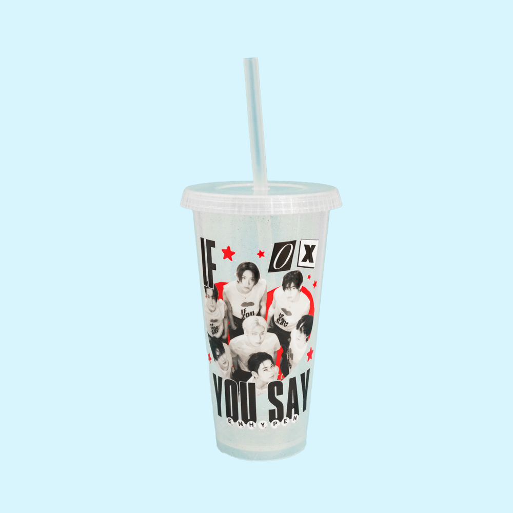 Elegante, misterioso y con un edge magnético, este vaso de colección inspirado en ENHYPEN es la fusión perfecta entre sofisticación y actitud. Su acabado glitter en tonos negros, blancos y rojos resplandece con intensidad sobre el fondo transparente tipo glass, reflejando la estética oscura y refinada que define el universo visual del grupo.